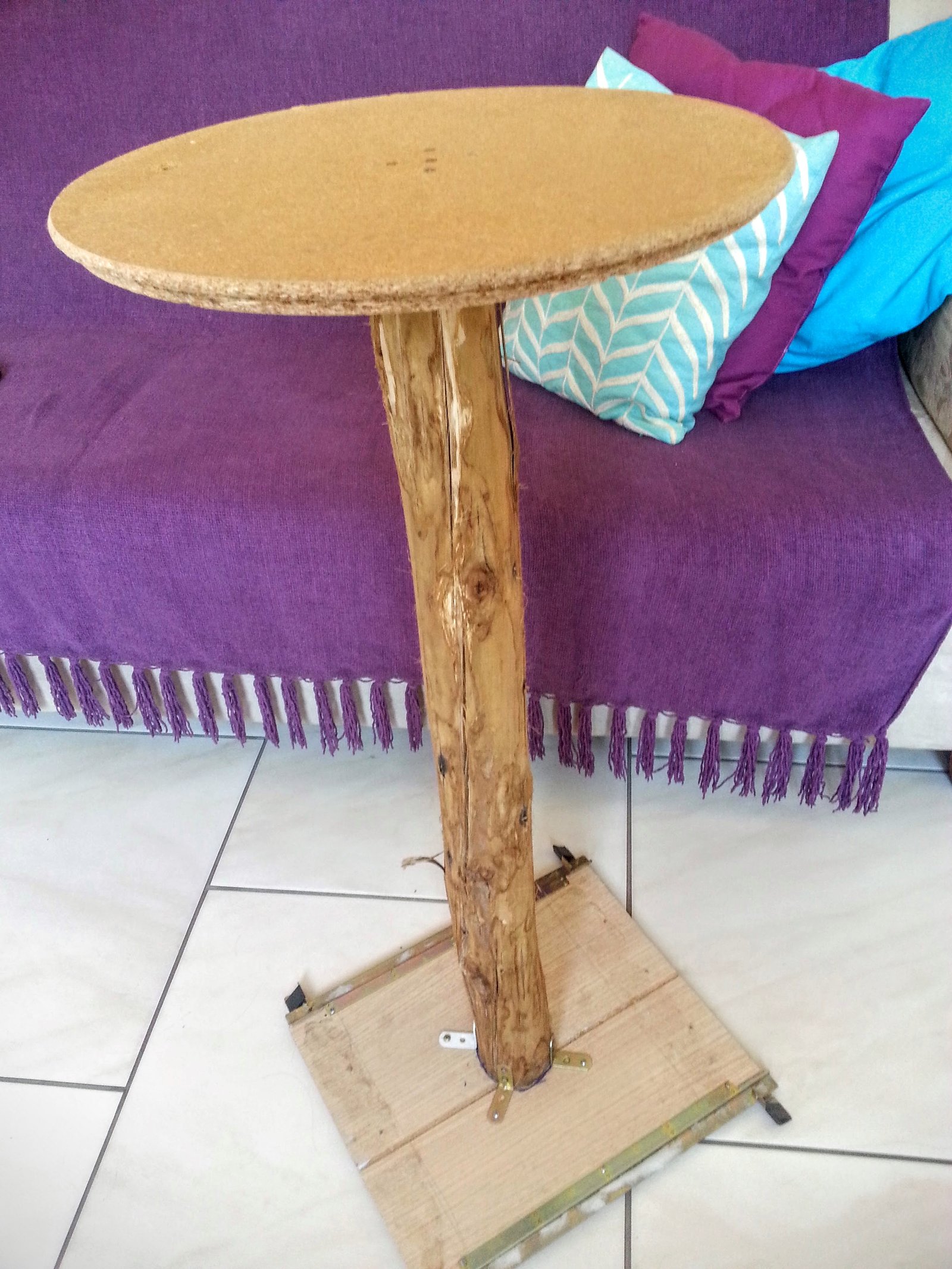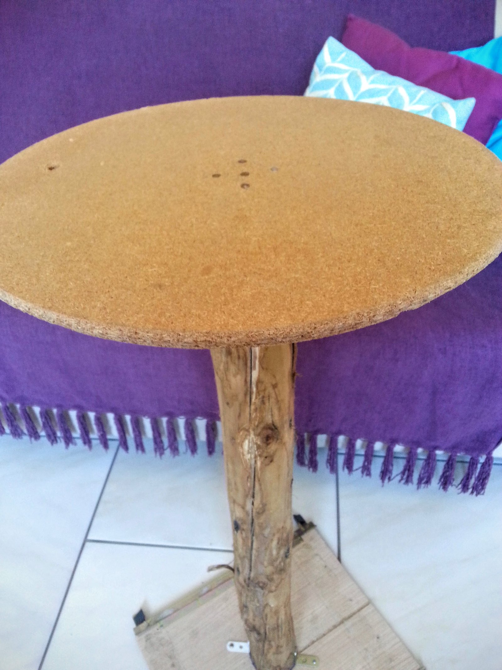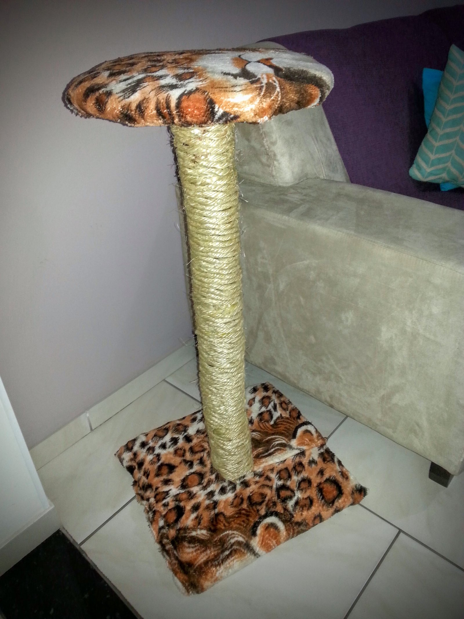 Pronto, agora já temos a espinha do arranhador. Só falta deixá-lo atrativo! Se você usar o tronco da árvore e deixar assim, ao arranhar, pode entrar alguma farpa nas pantufas do seu gatinho e com sisal não há perigo.