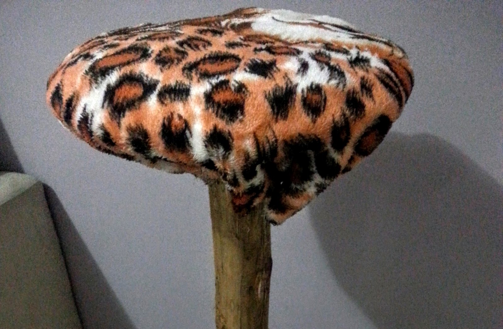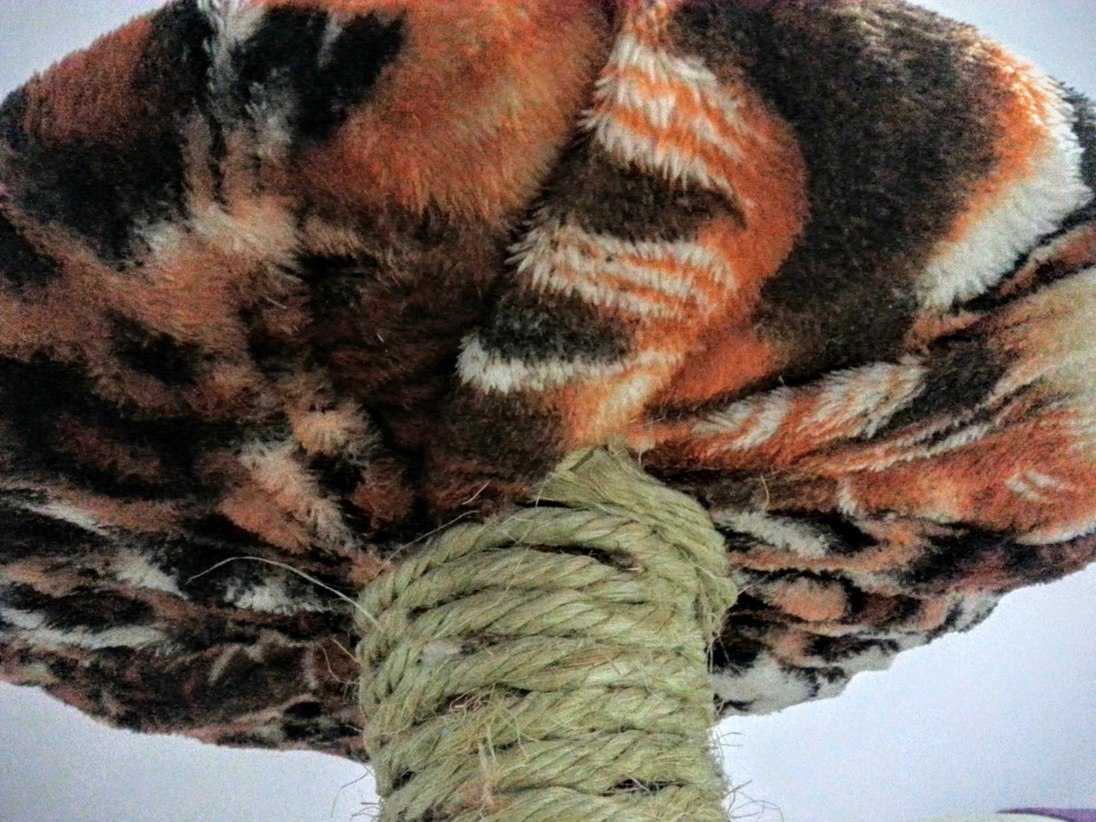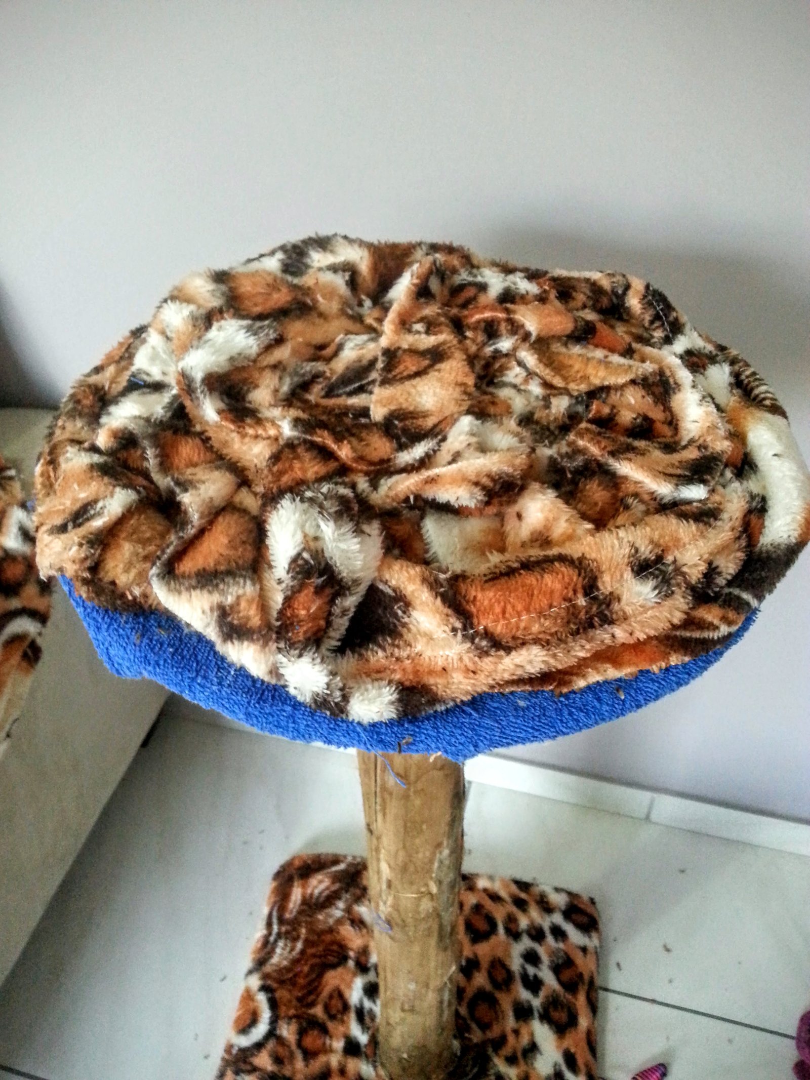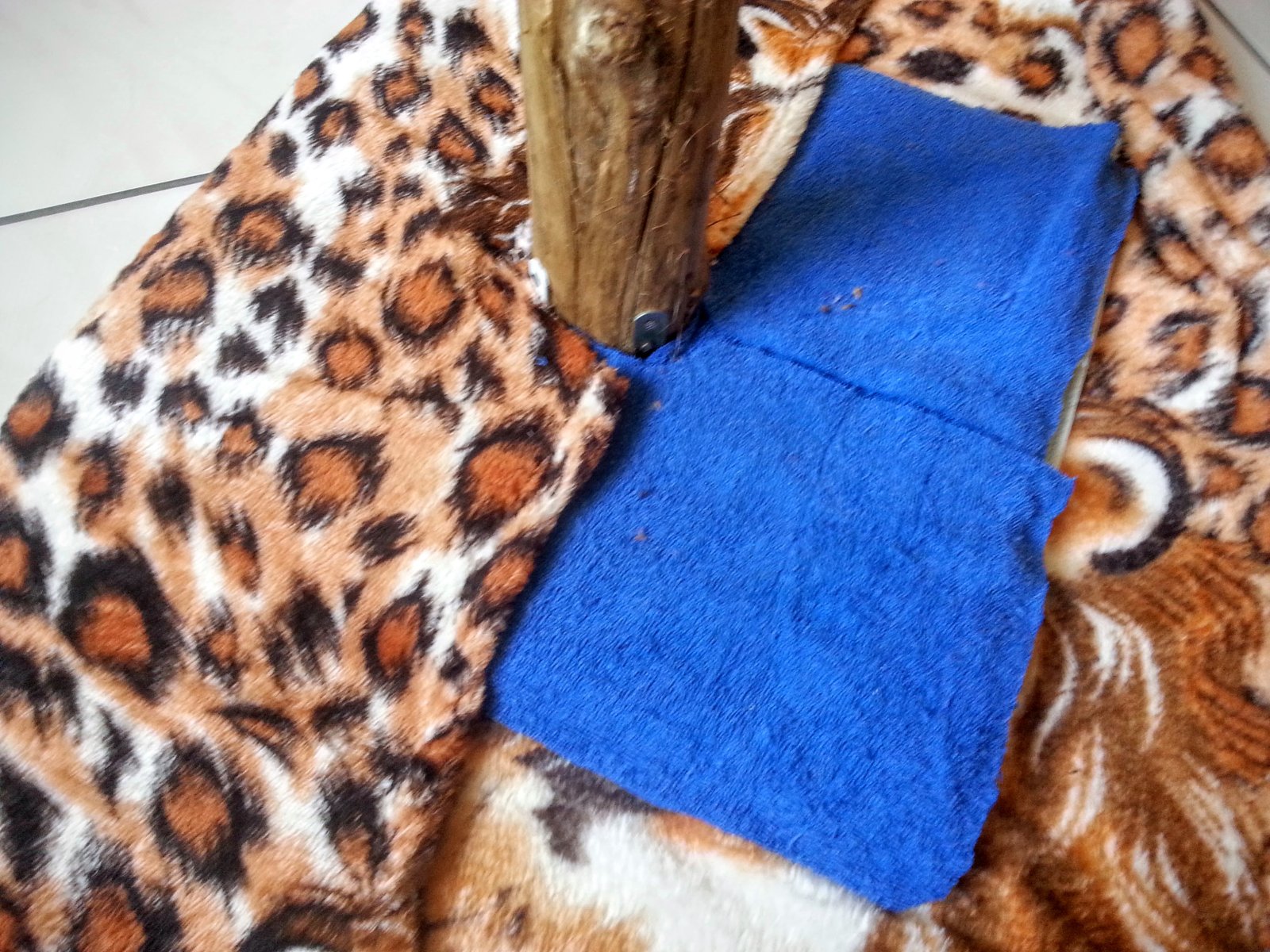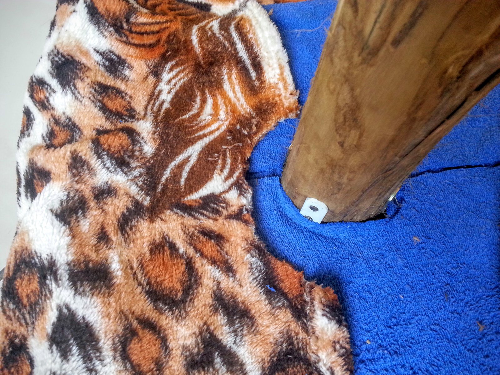 Como a manta que eu tinha em casa era muito fina, usei um tapetinho por baixo para deixar o arranhador mais aconchegante. Mas se sua manta ou cobertor for grosso, nem precisa. Usei cola quente para prender o tecido e o corte, eu fiz em meia lua como podem ver na foto. Foi a única maneira que encontrei de dar a volta no tronco da árvore.