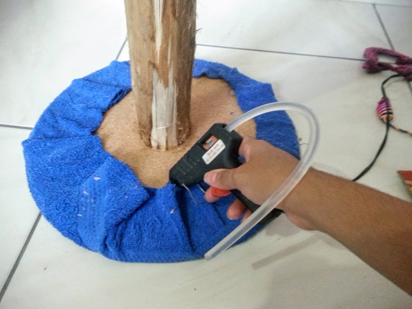 Aqui eu cortei um pedaço da manta e colei no tronco usando a cola de madeira. Não precisa de muito cuidado nessa hora porque quando for colar o sisal será feito o arremate.