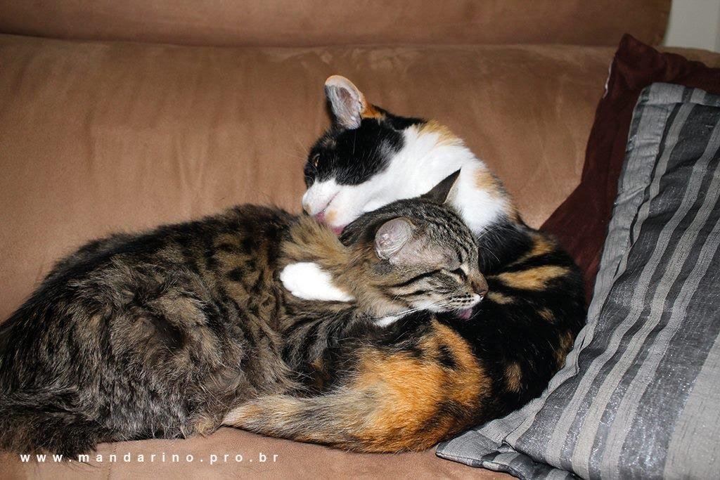 O fato é que já se passaram 4 meses e as três se dão bem. A Bella não gosta muito não, tem ciúmes… Mas até brincam de pega-pega. A Pepita adotou a Nina e não se desgrudam nunca. Podemos dizer que a adaptação ainda não acabou. A Bella por exemplo está mais carinhosa do que nunca. Não morde mais, não se agita com facilidade, deixa ser manipulada numa boa sem aqueles shows de horrores de antes. Pula no colo sempre que tem chance. Sempre se enroscando e dando cabeçadinhas. Porém uma mania voltou, sempre que saio pela manhã ela se põe a miar. A Nina, por incrível que pareça não teve nenhuma mudança de comportamento, acredito que pelo fato dela ter convivido sempre com outros cachorros e gatos. Então para ela, é tranquilo.