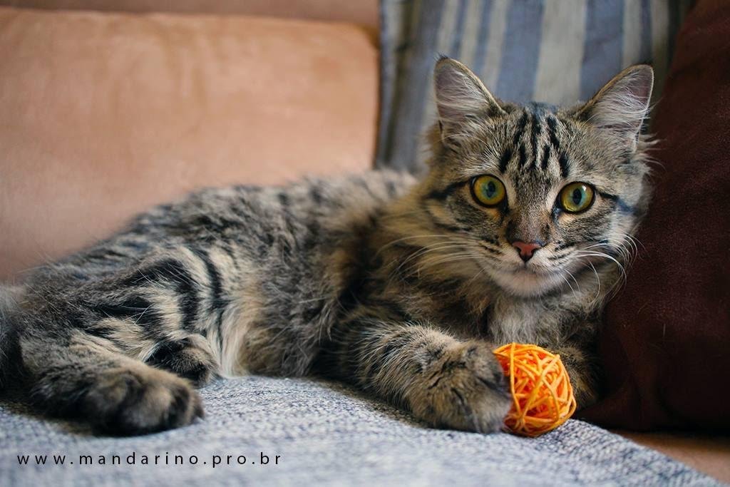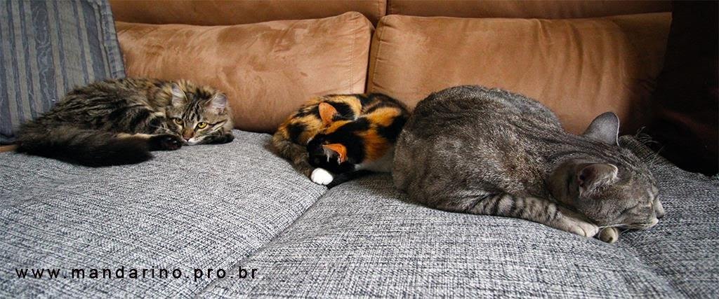 Quanto a Pepita, ela é dócil e como todo filhote muito brincalhona também. Só fica no colo se estivermos de pé… se sentarmos ela não fica de jeito algum. Não morde, não põe as unhas na gente. De início ela não ficava no mesmo ambiente que as outras gatas, agora já ficam todas juntas e até dividem o sofá. Vamos ver daqui pra frente como as coisas ocorrem. Agora, chega de gatos, três é o nosso limite.”