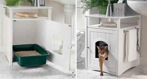 Se a caixa é o banheiro dos gatos, nada mais justo do que ela ficar dentro do banheiro da sua casa! Aqui, ela fica dentro de um lindo móvel que, além de discreto, serve pra apoiar outros objetos também.
