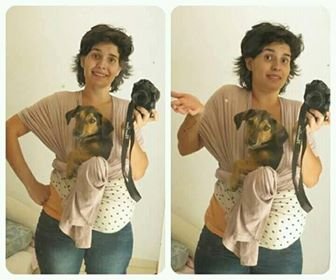 Numa manhã de segunda-feira levei meu bebê para a creche, de bicicleta, com meu filho amarrado no sling (esse tecido que prende o bebê ao corpo da mãe). Na volta, descendo uma rua bem movimentada, vi de longe algo na pista: os carros buzinando e desviando. Era um cachorro. Parei a bicicleta e o chamei para a calçada, ele veio balançando o rabo e ao mesmo tempo de cabecinha baixa. Fiz carinho, ameacei sair e ele veio atrás de mim. A única solução foi amarrar ele no sling do bebê para conseguir pedalar e chegar em casa.