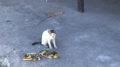 Como há muitos Canang Saris espalhados por toda cidade, é comum ver os gatinhos comendo os biscoitos das cestas.