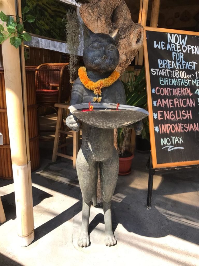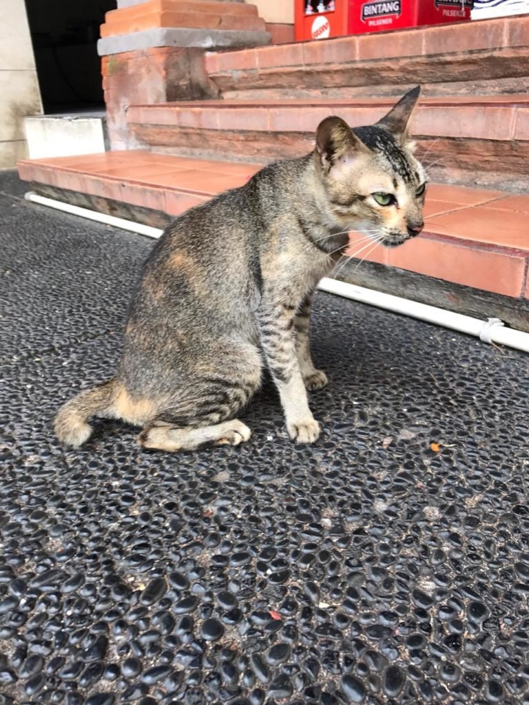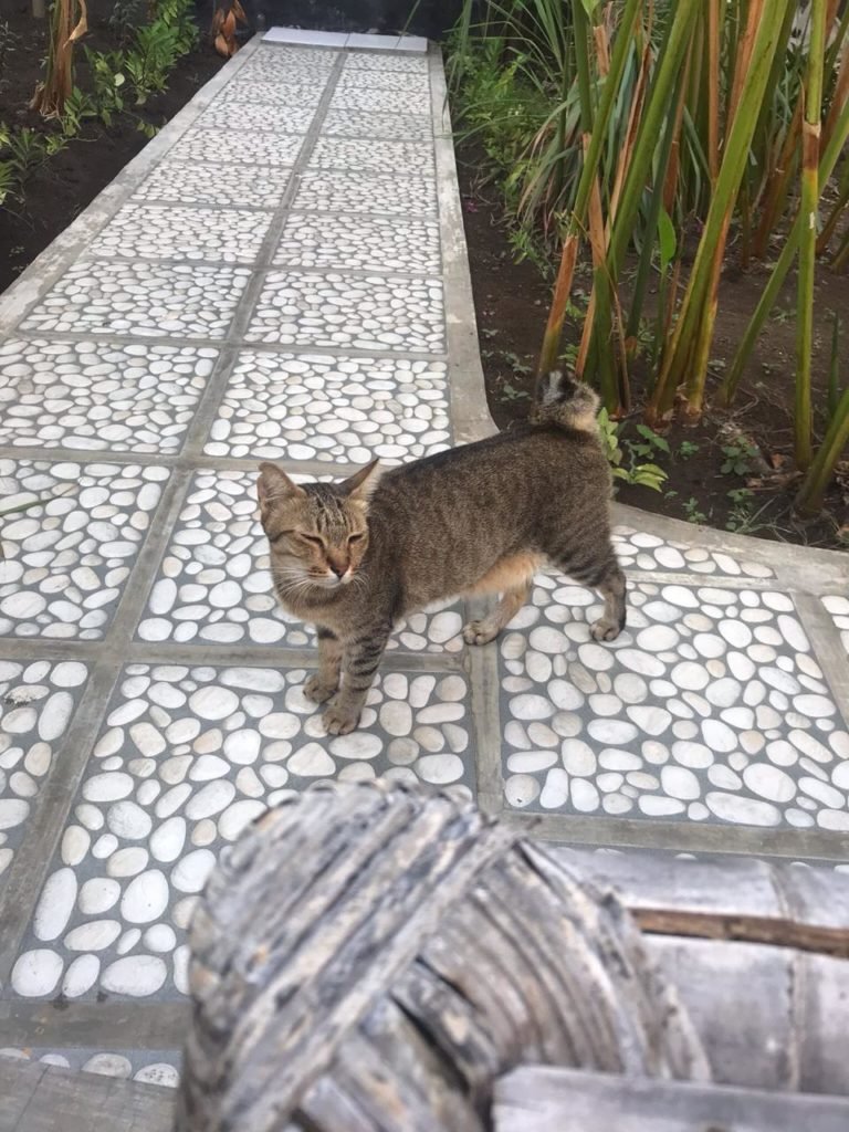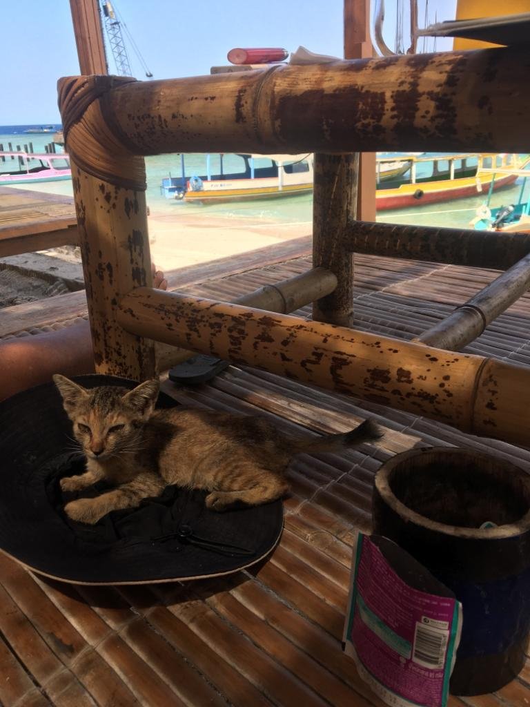 Gili possui inúmeros gatos, a maioria é castrado e com a marcação tão característica, o picote na orelha! A ilha possui uma política eficiente de controle populacional feita pelos médicos veterinários da ilha e por outros veterinários que se deslocam até lá.