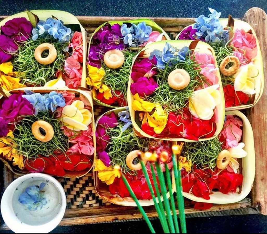 Canang Saris são cestas com flores, perfume, incenso e biscoitos que são oferecidas aos Deuses ou a uma pessoa muito querida. Caso esteja na ilha, você vai se deparar com uma cesta em quase todas as calçadas, casas, templos, praias, em cima das motos, carros etc.