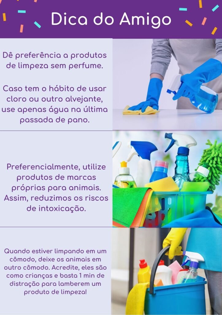Com atenção e cuidado, é possível deixar a casa limpa manter os animais em segurança. É preciso estar atento constantemente, afinal, até mesmo os produtos mais utilizados na hora da faxina como a cândida e o cloro podem causar intoxicação com sintomas como: vômito; tontura; salivação; entre outros.