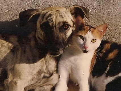 A Minie quando chegou era bem pequena, o Totó (o cachorro da foto) tambem era bem pequeno, tinha nascido a pouco tempo e a mae dele acabou por adotar a Minie; sim, os dois eram irmãos de leite. Depois de um tempo, já mais crescidos, costumavamos falar que eles eram namorados pois se davam muito bem (nota-se isso pela foto! rs).